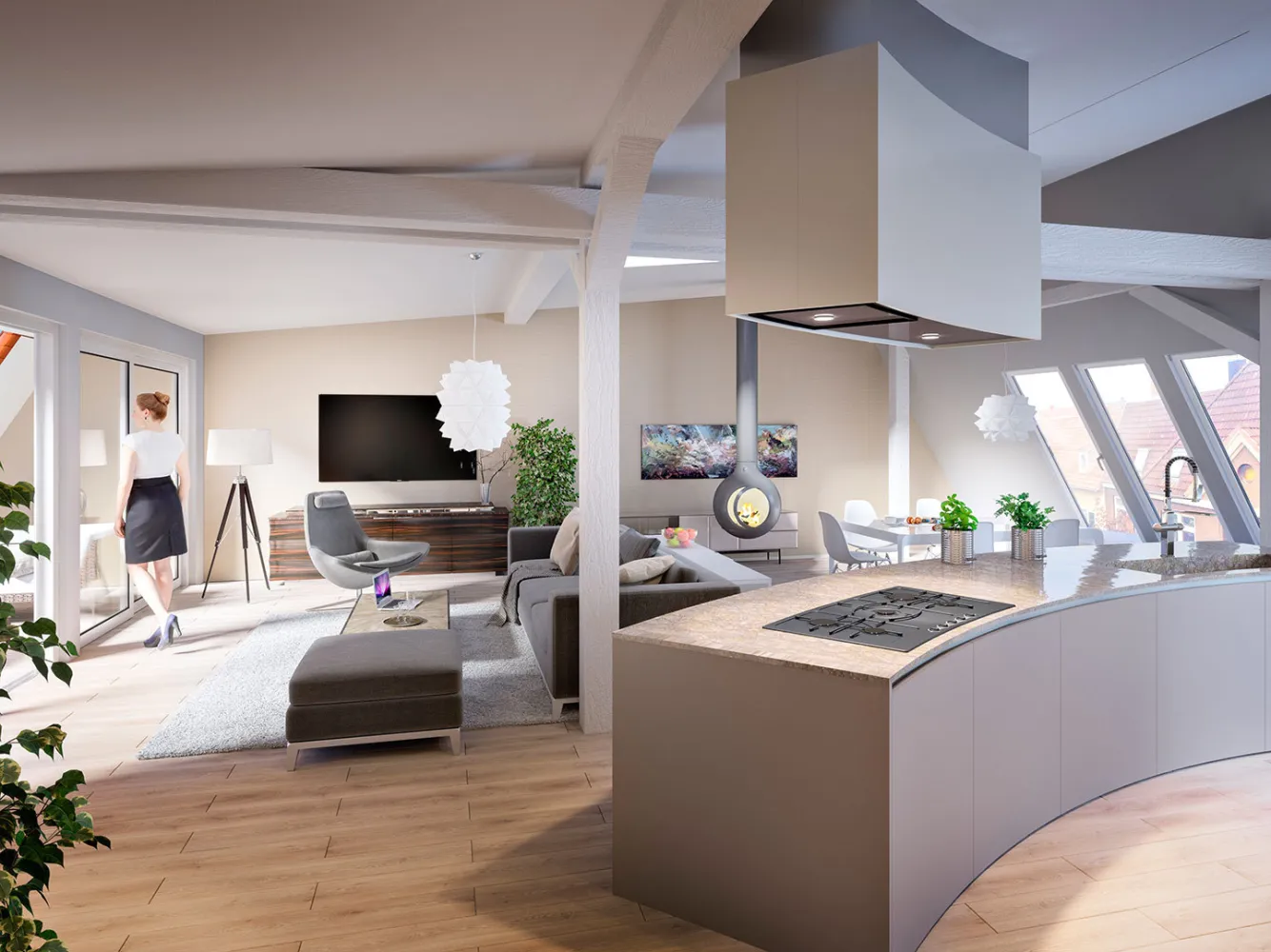 Die 3D Innenansichten von Einfamilien-, Mehrfamilienhäusern oder gewerblichen Gebäuden geben das fotorealistische Raumgefühl eindrucksvoll wieder. Auch der Lichteinfall und die Aussicht in die Umgebung werden sichtbar. Die Räume lassen sich nach Belieben einrichten und mit Accessoires ausstatten und vermitteln authentisch die Raumverhältnisse - egal ob die Immobilie noch bewohnt ist, gerade saniert wird oder sich sogar noch im Bau befindet. Ebenso wird die 3D Visualisierungs-Szene mit Leben und Atmosphäre gefüllt. Im Prinzip lässt sich das gesamte Home Staging digital umsetzen. Eine Innenrvisualisierung ist dann fast nicht mehr von einem realen Foto zu unterscheiden.