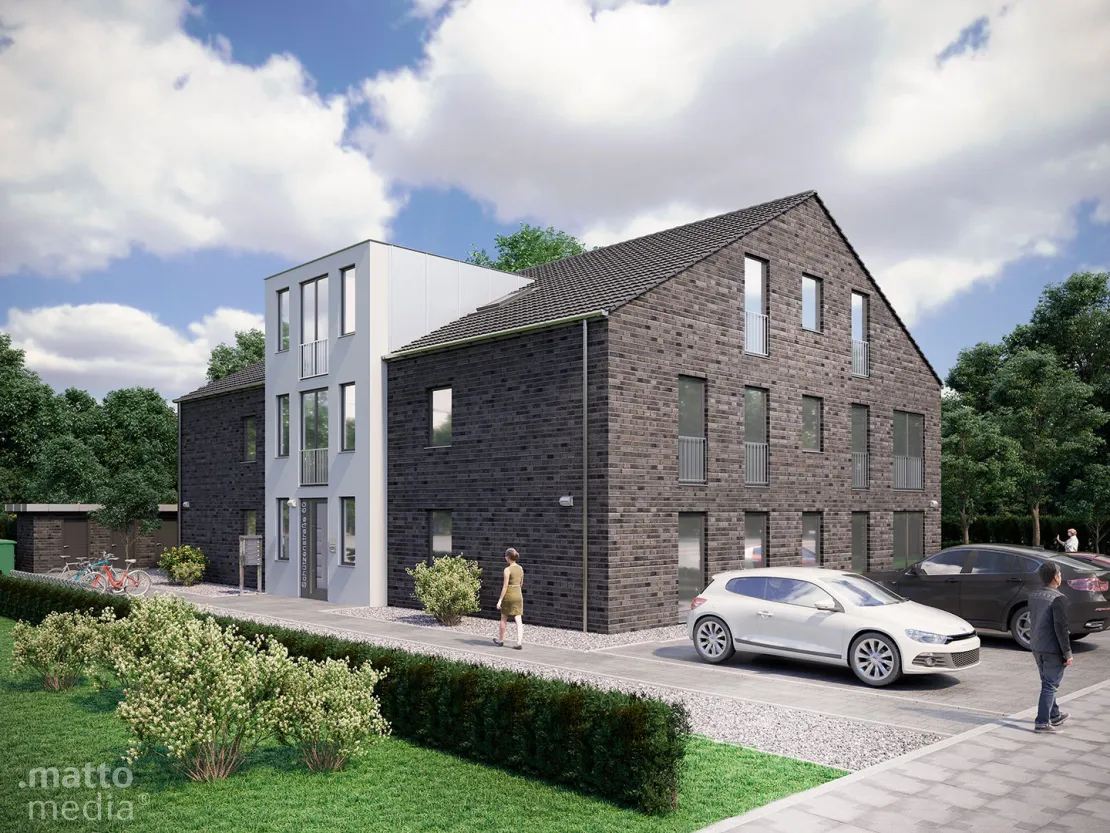 Die Architekturvisualisierungen zeigen zwei Aussen- und eine Innenansicht des geplanten Mehrfamilienhauses der Sparkasse Ochtrup. Die photorealistischen Darstellungen sind kaum von einer realen Photographie zu unterscheiden und spiegeln eindrucksvoll die zeitlose und moderne Architektur des Objekts in einem Mix aus viel Glas und dunkler Klinkerfassade wider.